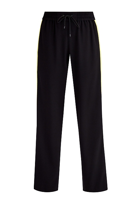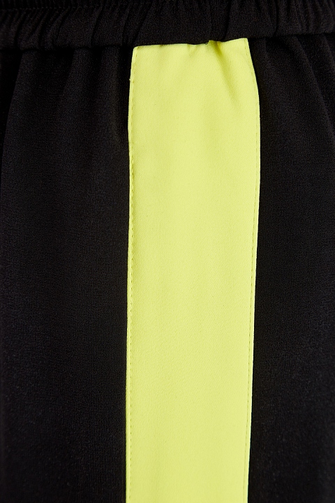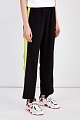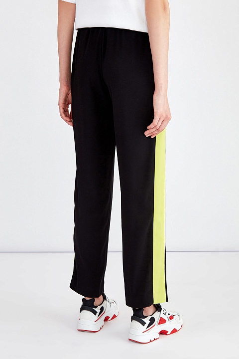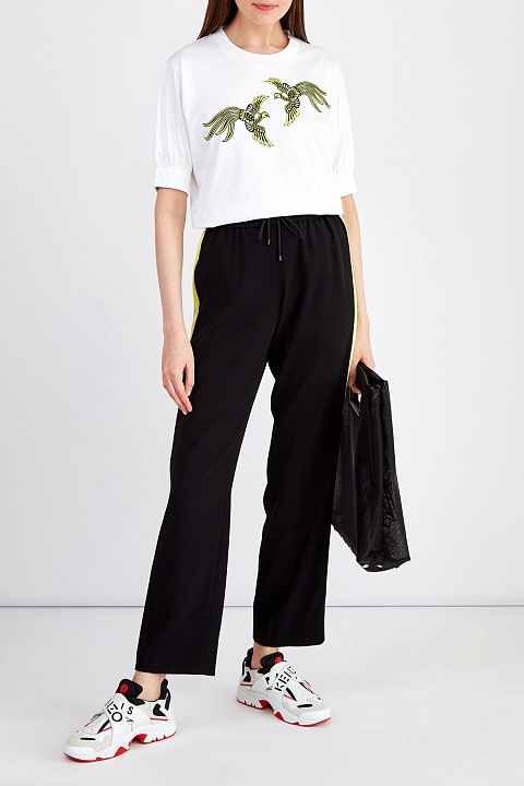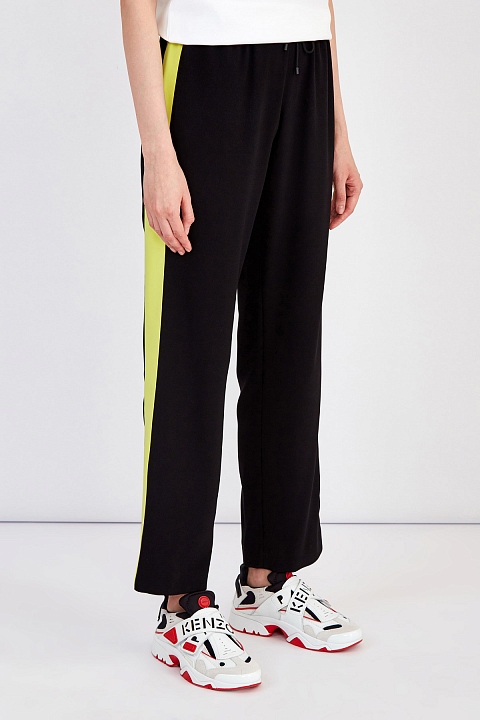 Укороченные широкие брюки от Kenzo выполнены из струящегося крепа, воздушная ткань придает элементу спортивного гардероба нотку элегантности. Модель в лаконичном черном цвете дополнена широкими неоново-зелеными лампасами по бокам, а также эластичным поясом с кулиской на люверсах.