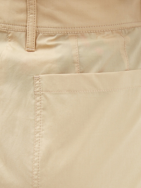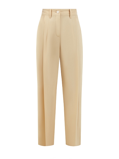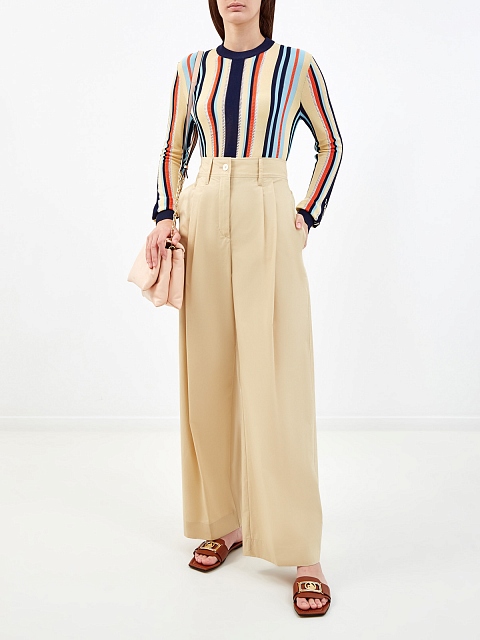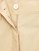 Бежевые брюки-палаццо от Lanvin созданы из дышащей хлопковой ткани. Текстурированный плотный материал подчеркивает расслабленные линии кроя и придает дизайну фирменный французский шик. Притачной пояс и два прорезных кармана делают модель функциональной и комфортной. Детали: высокая посадка, застежка на пуговицу и молнию.