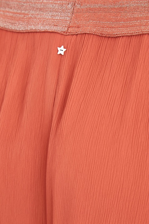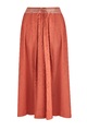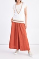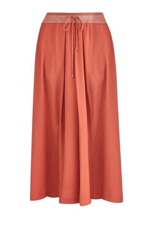Яркие брюки-кюлоты из коллекции Lorena Antoniazzi, созданные из шелка и ацетата с фактурной матовой поверхностью сочного терракотового цвета. Модель свободного укороченного кроя с посадкой на талии на притачном широком поясе из трикотажной резинки с регулировочным шнурком. Сделано в Италии.