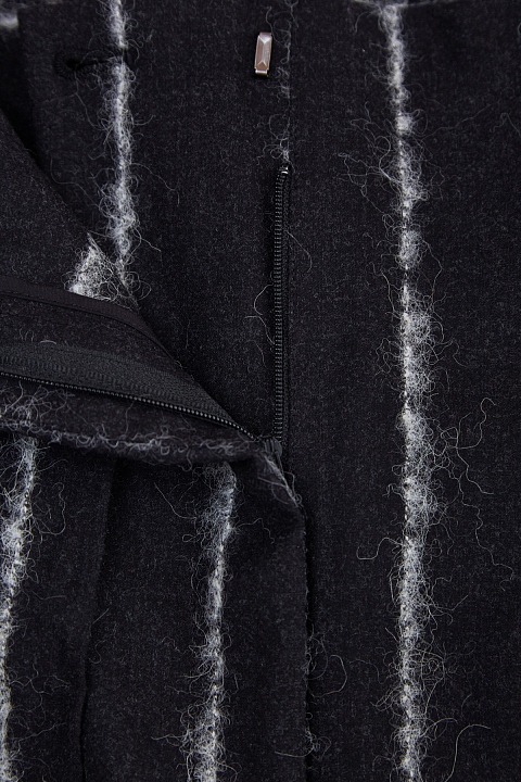 Элегантные женские брюки-палаццо из осенне-зимней коллекции Lorena Antoniazzi, созданные из уютной шерстяной ткани глубокого черного тона с классическим полосатым узором в новой объемной интерпретации: орнамент образован вшитыми ворсистыми нитями шерсти альпака и мохера контрастного тона. Образ завершает посадка на высокой линии талии, оформленная текстильным поясом, традиционные брючные карманы и застежка на молнию и крючок. Декоративная пуговица в форме звезды подчеркивает фирменный стиль изделия. Сделано в Италии.