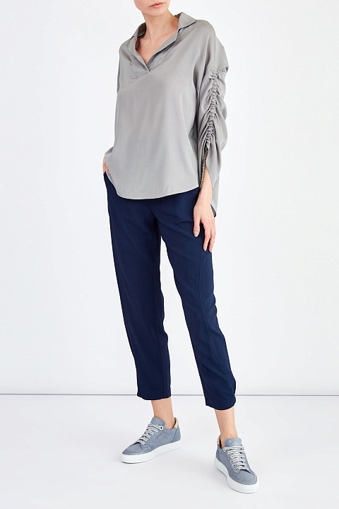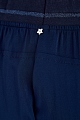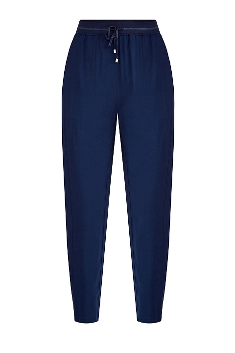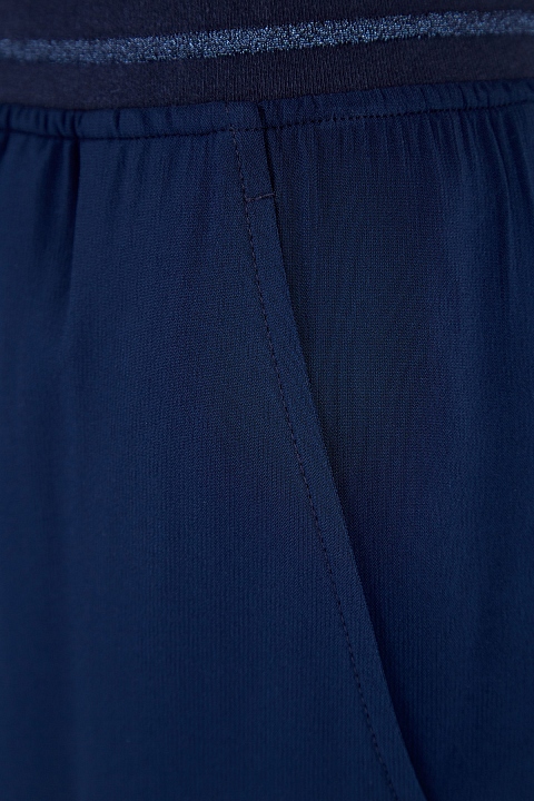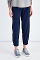 Укороченные женские брюки в стиле casual от Lorena Antoniazzi выполнены из струящейся ткани в насыщенном оттенке ночного неба. Контраст фактур подчеркивает трикотажный притачной пояс с кулиской и отделкой нитью люрекса. Объемный силуэт в спортивном стиле создают эластичные вставки по нижним кромкам. Детали: планки с фактурными швами, диагональные прорезные карманы. Сделано в Италии.