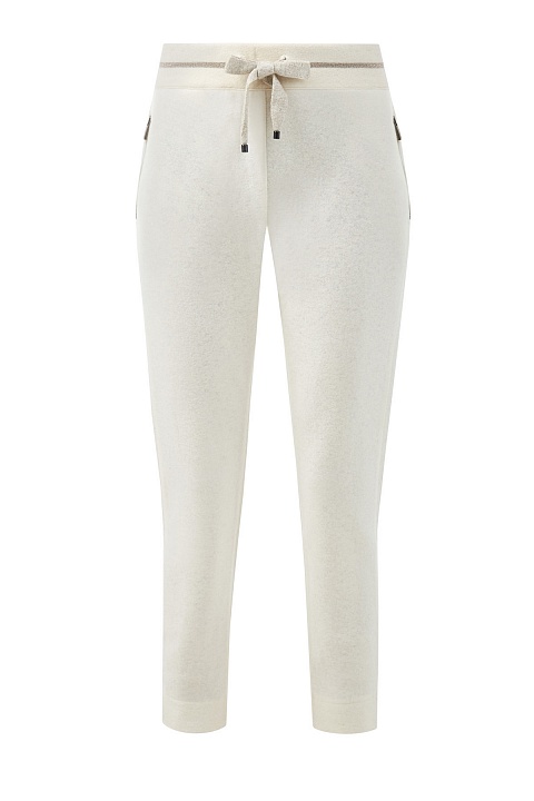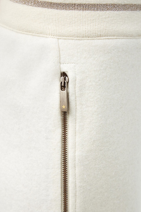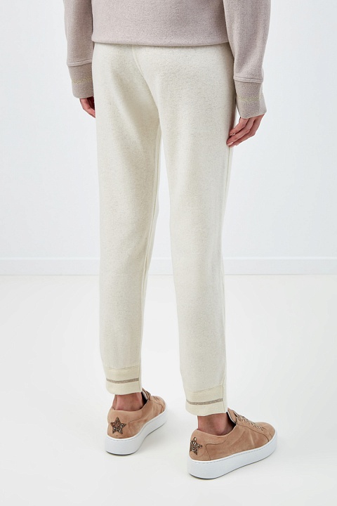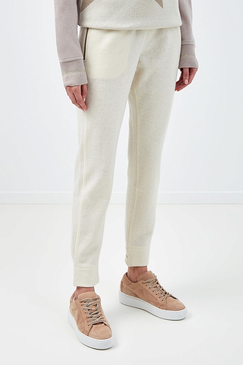 Спортивные брюки-джоггеры от Lorena Antoniazzi выполнены из шерсти и кашемира. Мягкая фланелевая текстура обеспечивает максимальный комфорт. Трикотажный пояс и манжеты на спинке дополнены золотистой нитью люрекса и вносят в образ сверкающие акценты. Детали: два кармана на молниях, кулиска на талии. Сделано в Италии.
