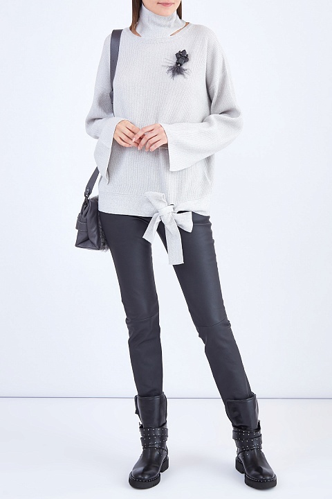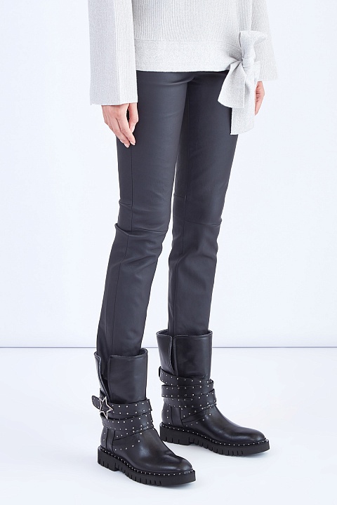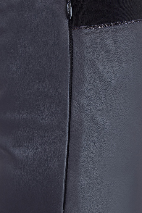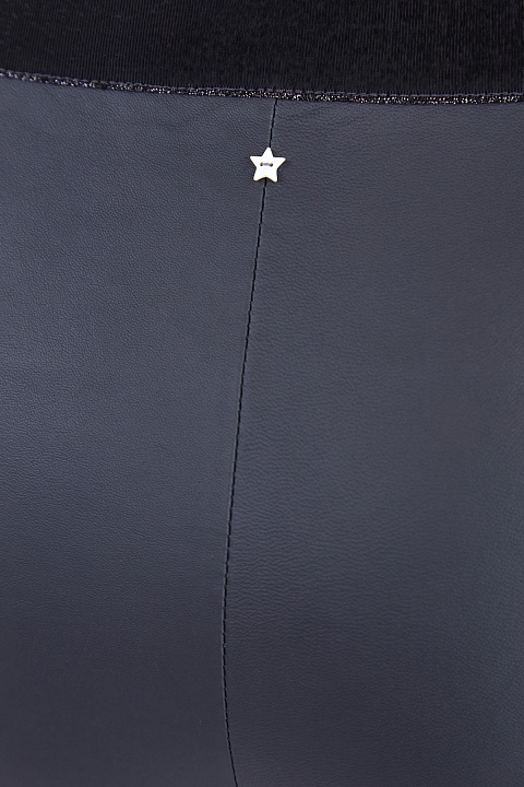 Лаконичные женские брюки Lorena Antoniazzi облегающего кроя выполнены из мягкой кожи графитового серого цвета. Модель с традиционной посадкой на талии, оформленной эластичным трикотажным поясом с лаконичной фирменной деталью — звездочкой на спинке. Сделано в Италии.