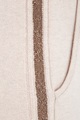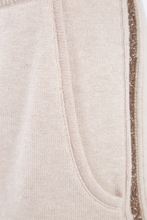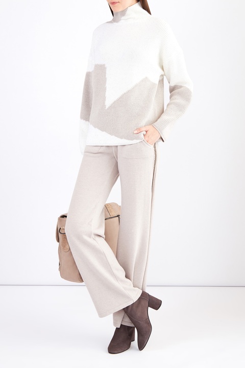 Стильные женские брюки из коллекции Lorena Antoniazzi, выполненные тонкой чулочной вязкой из мягкой и невесомой пряжи в составе шерсти и кашемира овсяного цвета. Модель расклешенного кроя характеризуется посадкой на талии на притачном поясе со шнурком и фронтальными карманами, обозначенными объемным швом по контуру. Ярким акцентом в образе являются вставки-лампасы из золотистой металлизированной нити. Сделано в Италии.