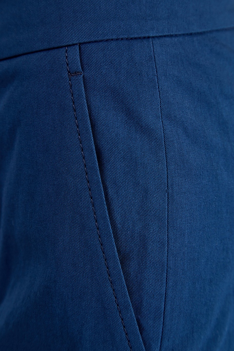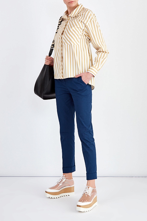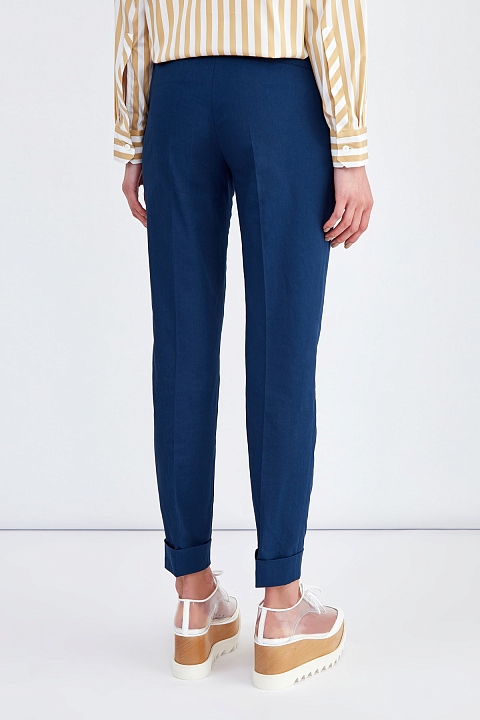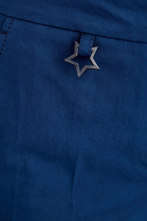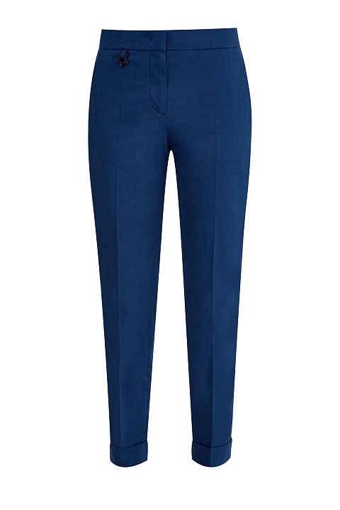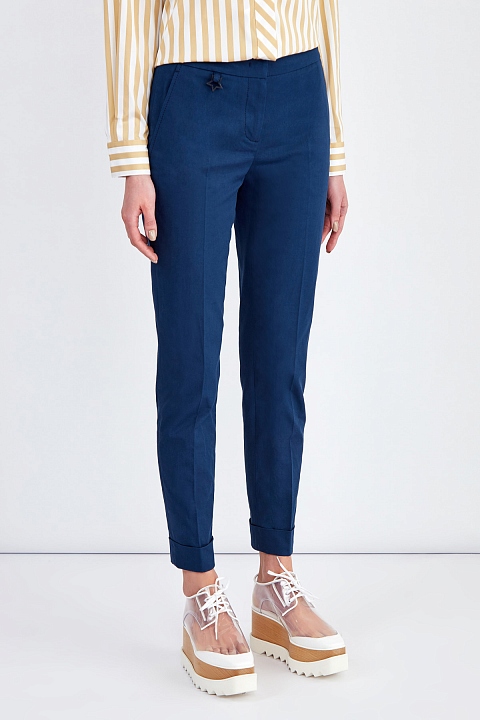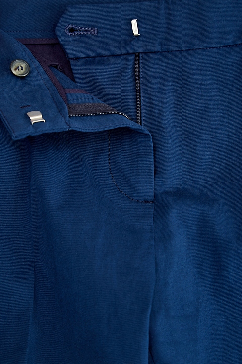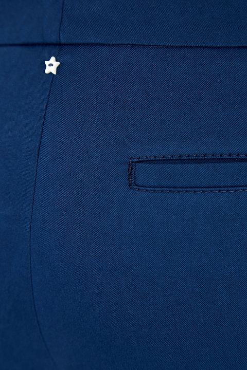 Лаконичные брюки от Lorena Antoniazzi созданы из хлопкового денима в глубоком сапфировом оттенке. Модель с прорезными карманами в классическом стиле дополнена потайной застежкой на металлический крючок и молнию. Детали: фирменная символика на спинке и в виде подвески на передней планке, отвороты по нижним кромкам. Сделано в Италии.