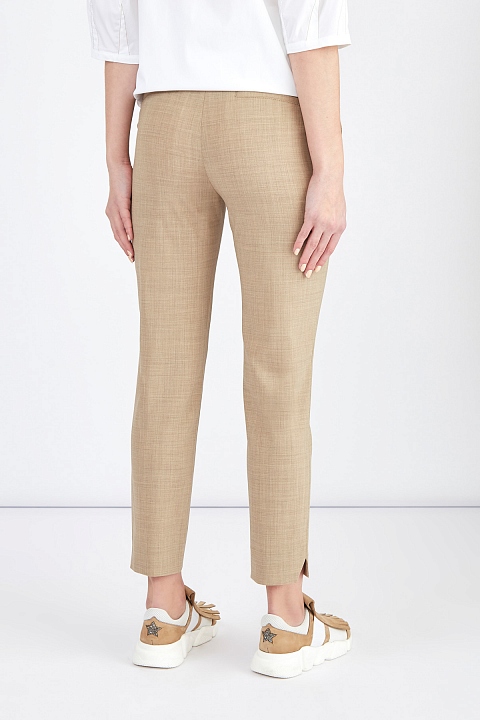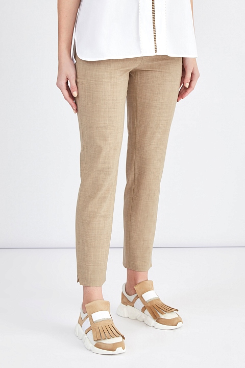 Брюки в классическом стиле от Lorena Antoniazzi созданы из струящейся шерстяной ткани в холодном песочном оттенке. Модель на стандартной посадке дополнена поясом split с отделкой мерцающим люрексом. Динамику образу придают разрезы по нижним кромкам. Детали: прорезные диагональные карманы, застежка на пуговицу, крючок и молнию. Сделано в Италии.