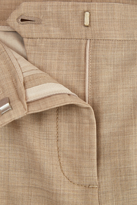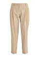 Строгие брюки длины ⅞ от Lorena Antoniazzi выполнены из легкой шерстяной ткани с узором в клетку в холодных карамельных тонах. Защипы от линии талии, высокая посадка и зауженный книзу крой формируют гармоничный силуэт. Лампасы по боковым швам выполнены из тканой тесьмы с вплетенными нитями люрекса. Детали: прорезные карманы, присборенные манжеты на спинке, фирменный элемент в виде звезды на спинке. Сделано в Италии.