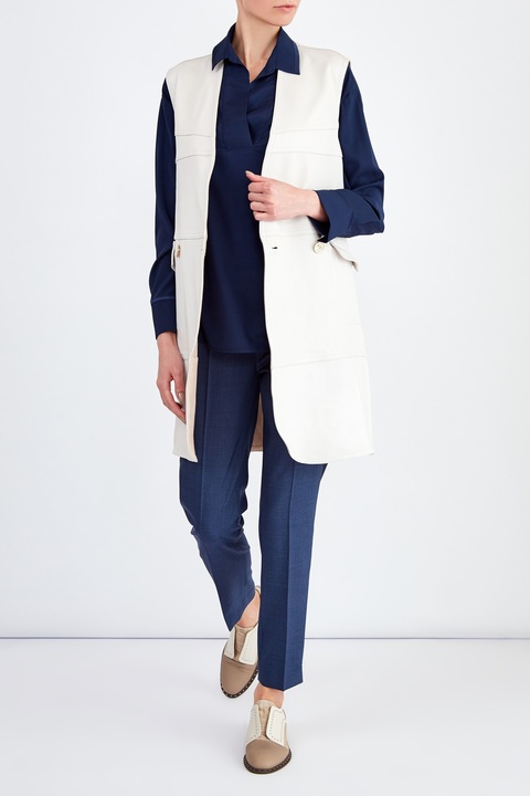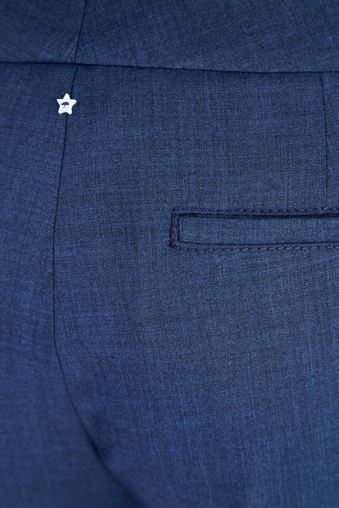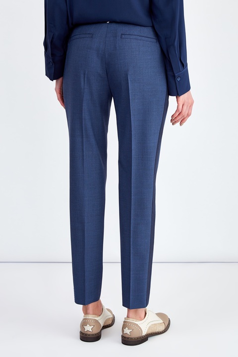 Брюки в стиле спортшик от Lorena Antoniazzi созданы из струящейся шерстяной ткани в глубоком сапфировом оттенке. Модель на стандартной посадке дополнена притачным поясом. Динамику образу придают вставки-лампасы из трикотажа по боковым швам. Детали: прорезные диагональные карманы, потайная застежка на пуговицу, крючок и молнию. Сделано в Италии.