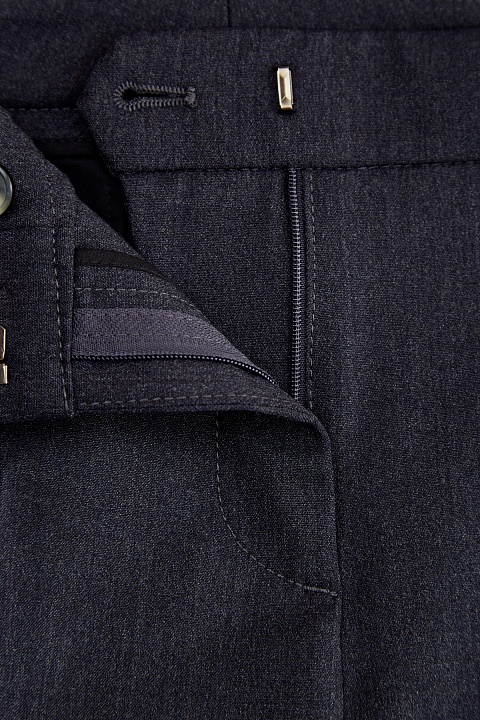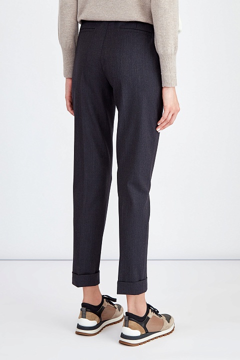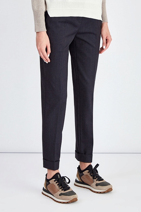 Лаконичные брюки от Lorena Antoniazzi из струящейся легкой шерстяной нити. Минималистичный дизайн в классическом черном оттенке дополнен отворотами. Притачной пояс оформляет прямой крой изделия. Детали: фирменная подвеска, прорезные карманы, застежка на потайной крючок и молнию, символика бренда на спинке. Сделано в Италии.
