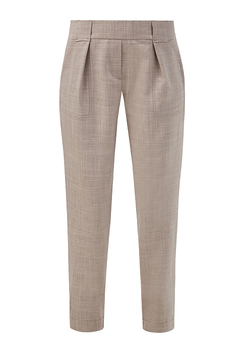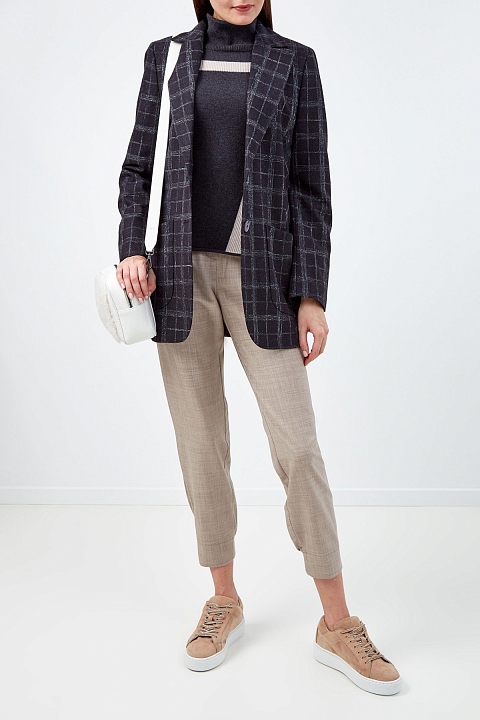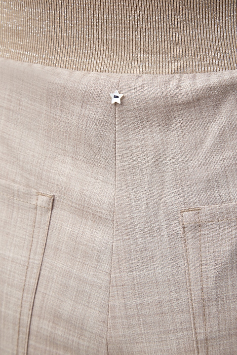 Брюки в стиле casual от Lorena Antoniazzi выполнены из струящейся костюмной шерстяной ткани. Динамичные акценты в образ вносит эластичная отделка пояса и манжет на спинке, а также заимствованные у джинсов накладные карманы. Детали: длина ⅞, мерцающая отделка золотистой нитью люрекса, символика бренда из перламутра. Сделано в Италии.