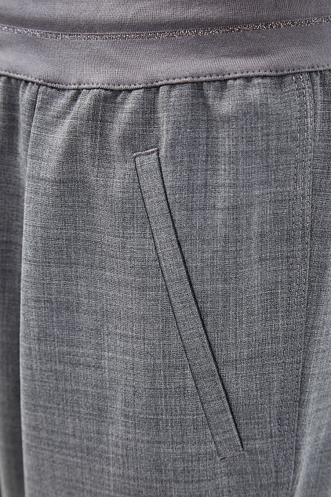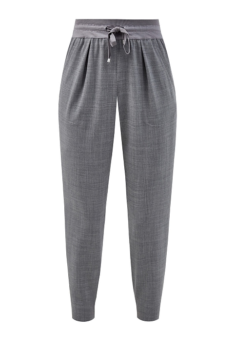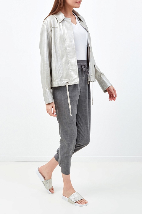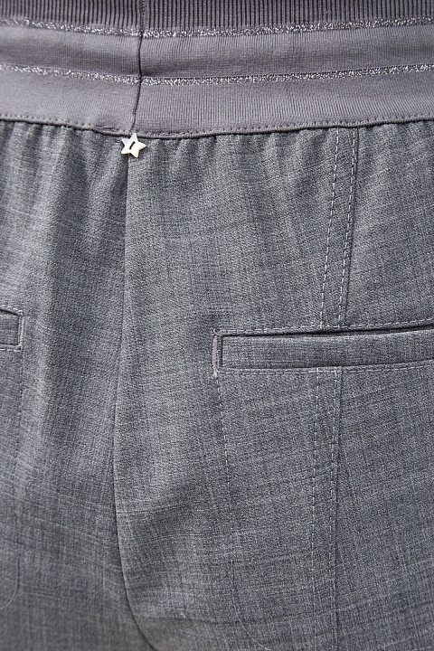 Базовые брюки-джоггеры от Lorena Antoniazzi выполнены из костюмной шерстяной ткани в жемчужно-сером цвете. Классический материал контрастирует с трикотажной отделкой пояса и нижних кромок, нить люрекса вносит в образ сверкающий акцент. Заложенные от линии талии складки подчеркивают струящуюся фактуру натурального материала. Детали: прорезные карманы, символика бренда на спинке. Сделано в Италии.