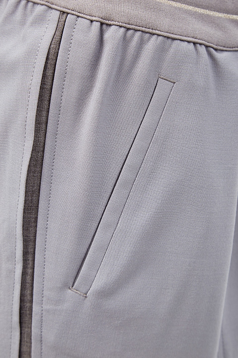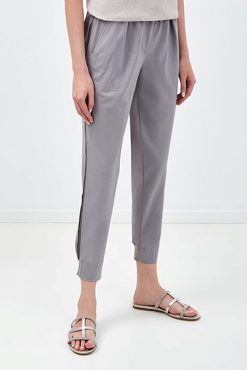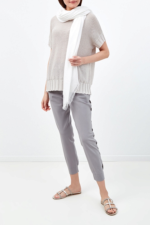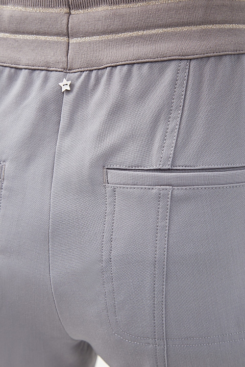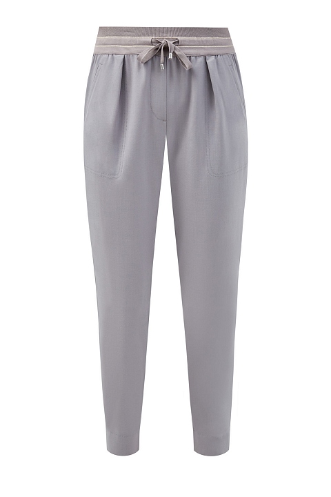 Базовые брюки от Lorena Antoniazzi прямого кроя выполнены из костюмной шерстяной ткани в сером цвете. Классический материал контрастирует с трикотажной отделкой пояса и нижних кромок, объемные швы придают нотку неформального шика. Скрытые контрастные лампасы завершают дизайн. Детали: прорезные карманы, символика бренда на спинке. Сделано в Италии.