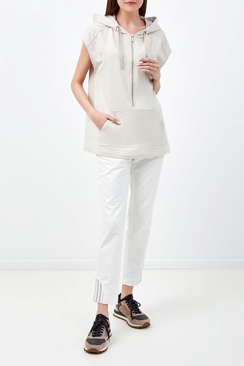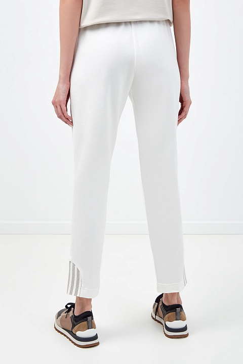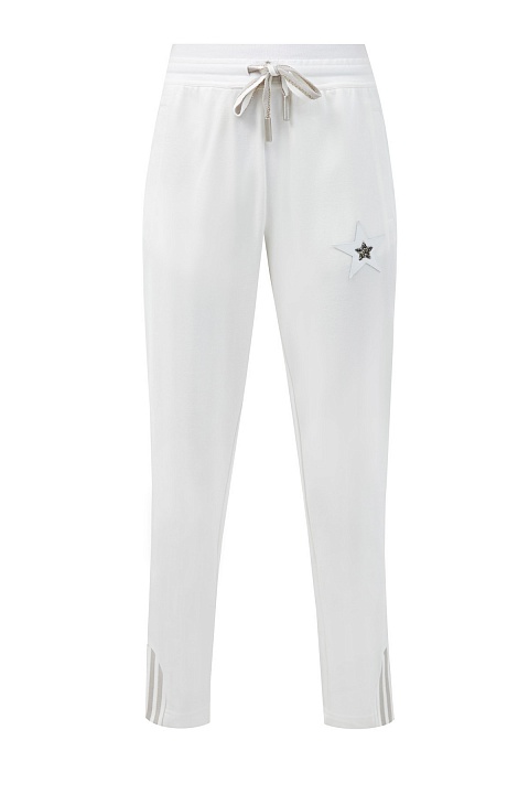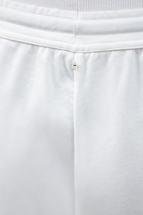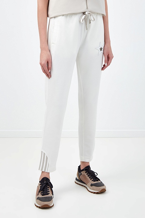 Спортивные брюки от Lorena Antoniazzi выполнены из хлопкового футера. Выверенный состав обеспечивает максимальный комфорт в движении. Контраст фактур в образ вносят вставки в рубчик по нижнему краю и нашивка из кожи с мерцающими кристаллами Swarovski. Детали: трикотажный пояс на кулиске, символика бренда из перламутра на спинке, два кармана. Сделано в Италии.