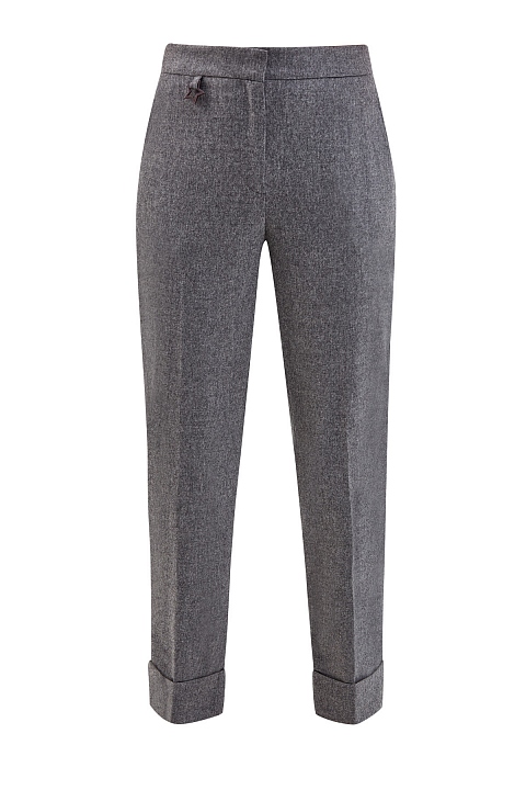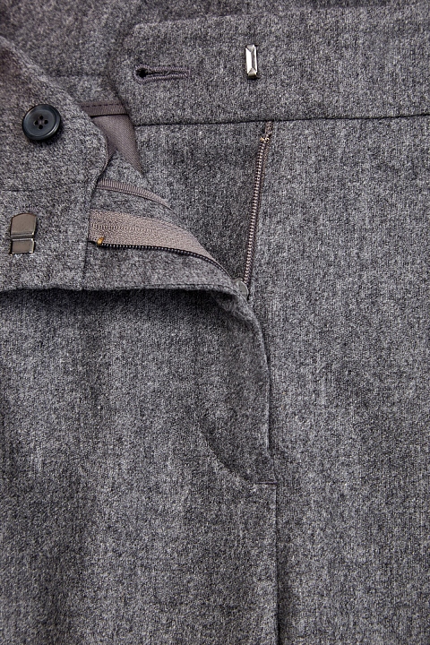 Минималистичные брюки от Lorena Antoniazzi выполнены из шерстяной фланели с peach-эффектом по поверхности. Классический прямой крой и костюмная ткань придают образу строгость. Вытачки обеспечивают посадку по фигуре. Детали: четыре кармана, отвороты, потайная застежка, символика бренда из перламутра на спинке. Сделано в Италии.