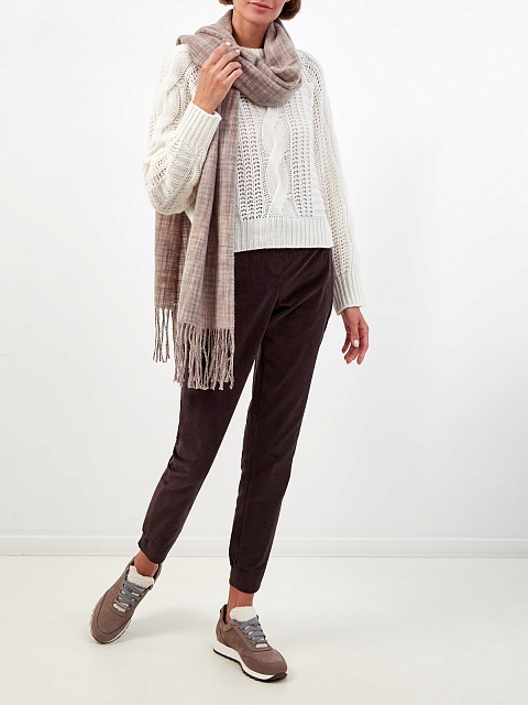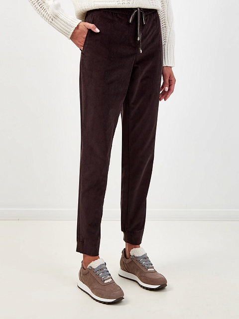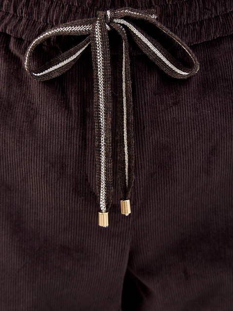 Стильные брюки от Lorena Antoniazzi созданы из фактурного бархатистого вельвета на основе хлопка. Волокна эластана в составе обеспечивают комфорт в движении, пояс на регулируемой кулиске с нитью ламе придает образу расслабленный штрих. Детали: прорезные карманы по бокам, эластичные манжеты. Сделано в Италии.