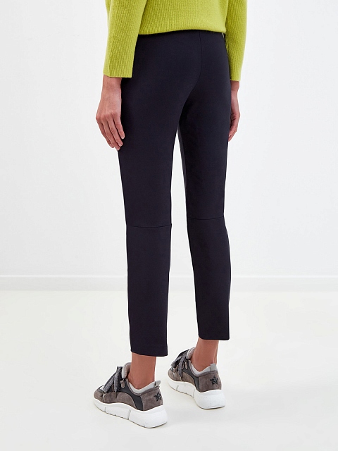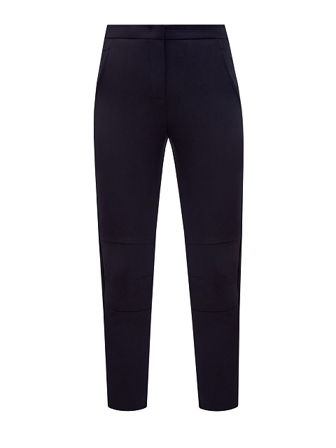 Зауженные брюки от Lorena Antoniazzi выполнены из хлопковой костюмной ткани. Синтетические волокна в составе предотвращают появление складок и обеспечивают свободу движений. Вытачки на коленях и эластичная вставка на поясе подчеркивают присущий бренду неформальный стиль. Детали: застежка на крючок, пуговицу и молнию, два кармана. Сделано в Италии.