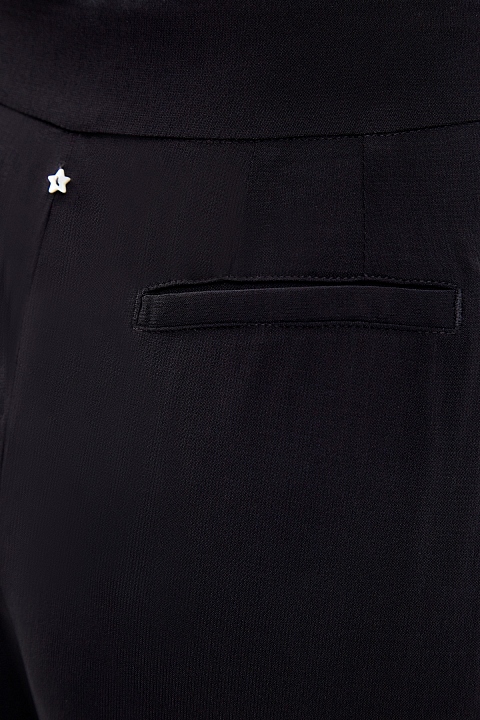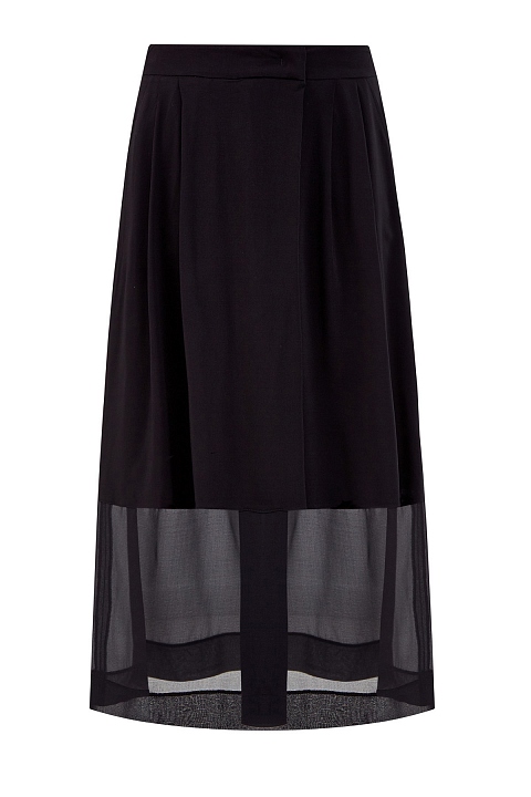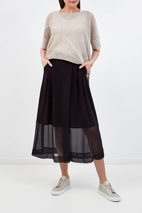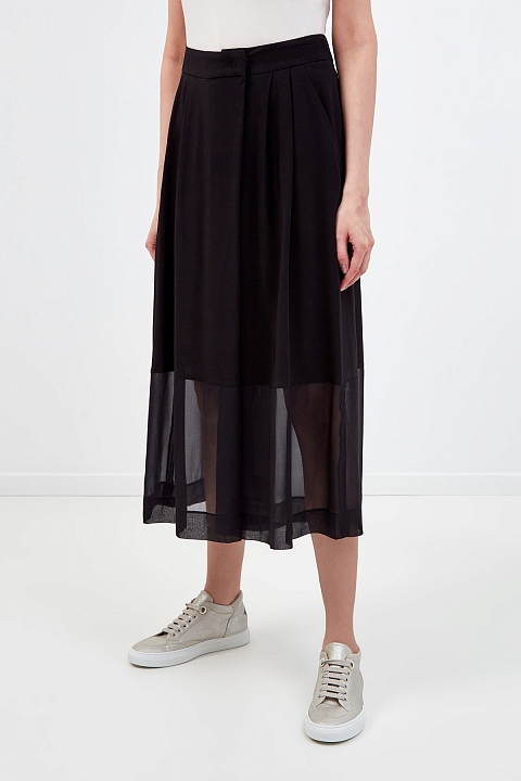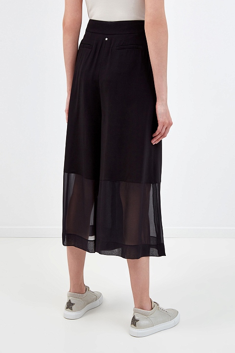 Элегантные кюлоты от Lorena Antoniazzi созданы из гладкой костюмной ткани. Заложенные от пояса складки подчеркивают струящуюся фактуру материала, а вставки из полупрозрачного шифона придают образу легкость. Детали: высокая посадка, застежка на пуговицу, крючок и молнию, символика бренда из перламутра на спинке.Сделано в Италии.