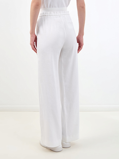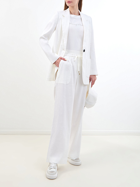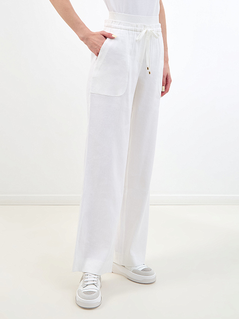 Стильные женские брюки от Lorena Antoniazzi выполнены из дышащей льняной ткани и вискозы, эластичные волокна в составе облегчают уход за изделием. Свободный крой идеально подходит для создания повседневных образов в стиле leisure. Широкий эластичный пояс на регулируемой кулиске обеспечивает комфортную посадку. Детали: макро-карманы, символика бренда на спинке. Сделано в Италии.