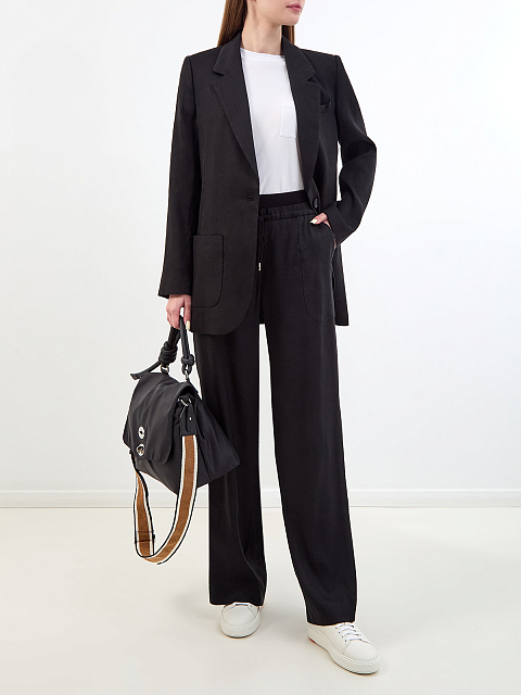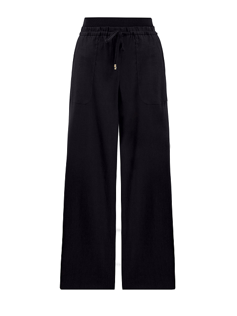 Женские брюки в черном цвете от Lorena Antoniazzi выполнены из дышащей льняной ткани и вискозы, эластичные волокна в составе облегчают уход за изделием. Свободный крой идеально подходит для создания повседневных образов в стиле leisure. Широкий эластичный пояс из трикотажа на регулируемой кулиске обеспечивает комфортную посадку. Детали: макро-карманы, символика бренда на спинке. Сделано в Италии.