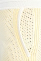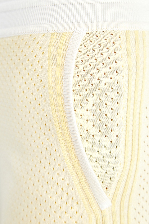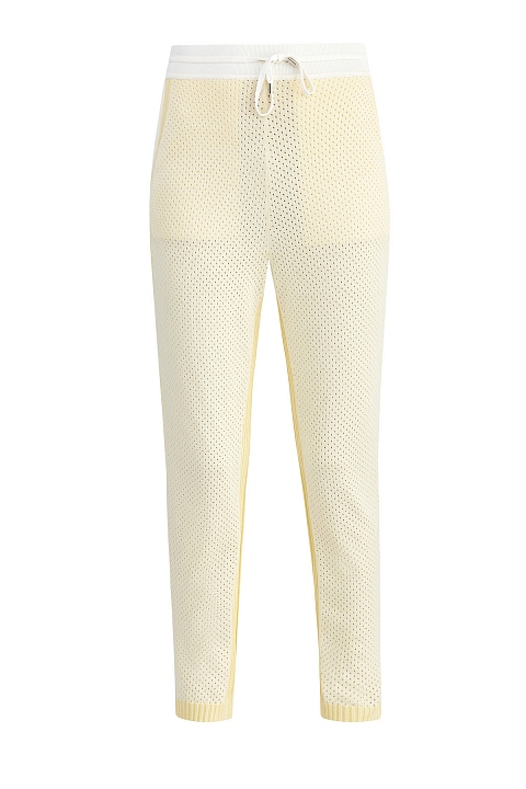 Стильные брюки от Maison Ullens выполнены из хлопковой перфорированной ткани. Нижние кромки и боковые швы дополнены отделкой из хлопковой пряжи: техника вязки в рубчик образует фактурную поверхность с узором в полоску в лимонно-желтых оттенках. Комфортную посадку обеспечивает притачной пояс на кулиске, прорезные карманы завершают дизайн. Сделано в Италии.
