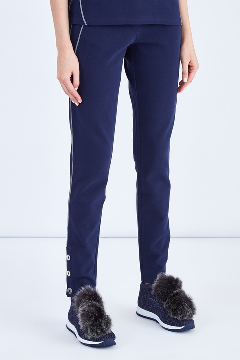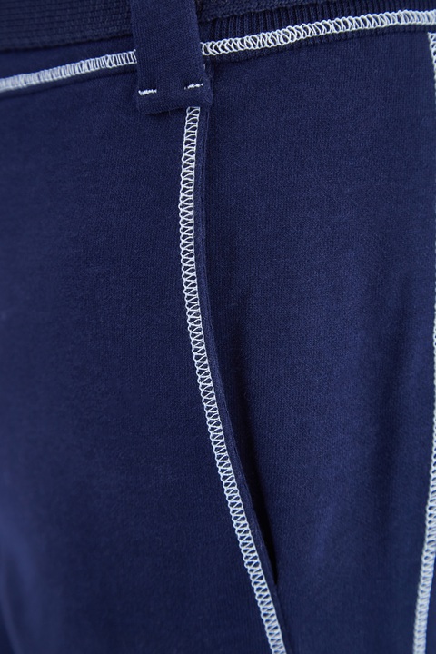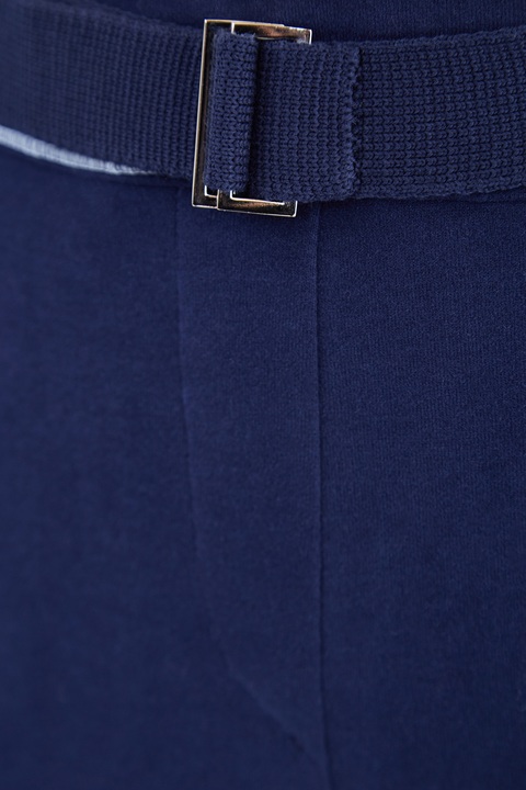 Спортивные брюки от Maison Ullens выполнены в насыщенном синем оттенке из плотного хлопкового джерси с волокнами кашемира в составе. Сложный крой изделия подчеркнут объемными швами нитью контрастного белого тона в морском стиле. Изделие дополнено притачным поясом со съемным тканым ремнем, а также нижними кромками с застежкой на кнопки. Прорезные карманы завершают дизайн. Сделано в Италии.
