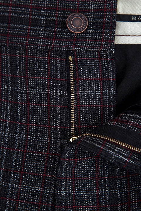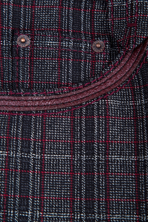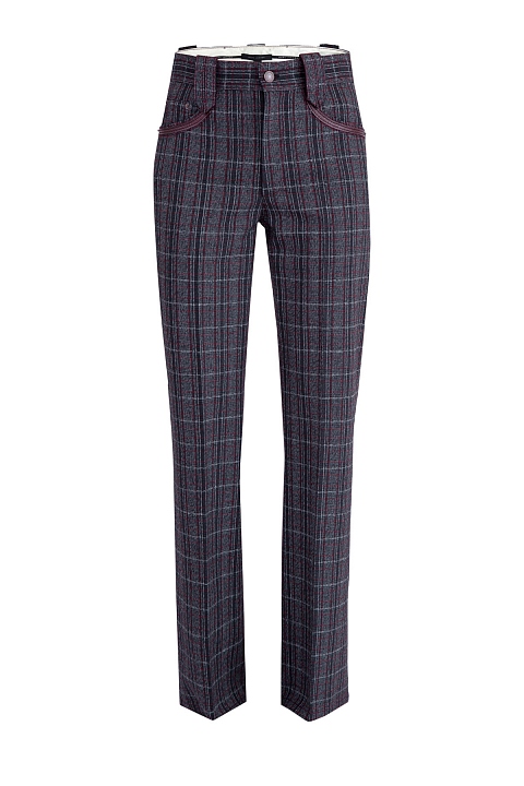 Женские брюки Marc Jacobs в ретро стиле расклешенного кроя. Модель выполнена из ворсистой шерсти с клетчатым узором в серо-бордовой гамме. Модель характеризуется высокой посадкой с притачным поясом, застежкой на молнию и пуговицу и карманами с кожаными вставками.