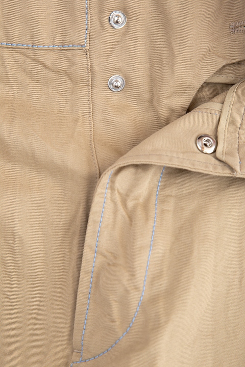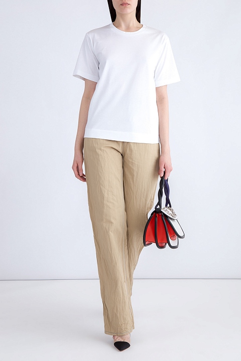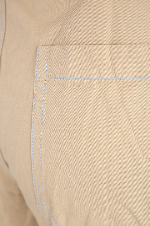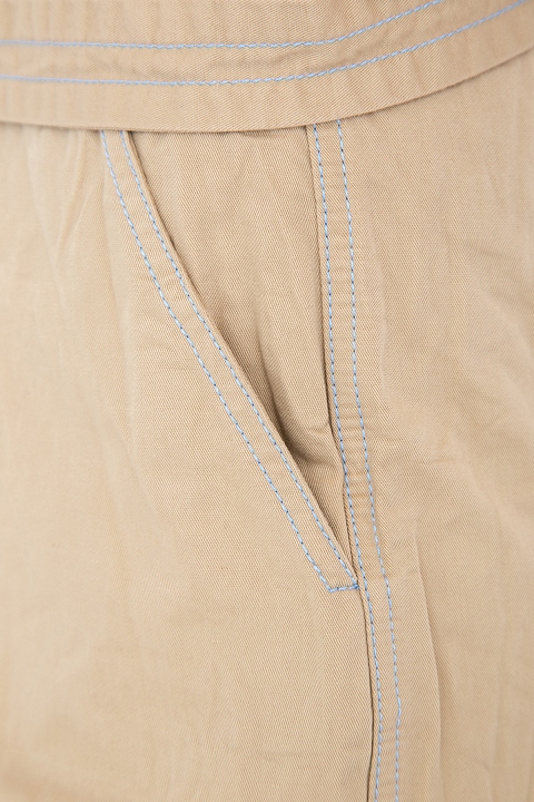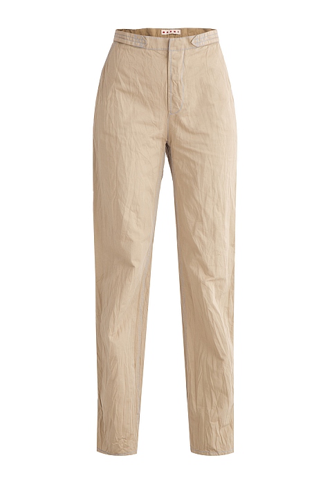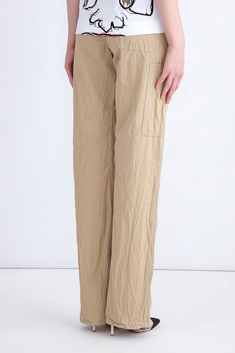 Оригинальные женские брюки из весенне-летней коллекции Marni выполнены из микса хлопка и льна с жатым эффектом в песочном оттенке. Модель дополнена контрастной прострочкой голубой нитью по швам. Расклешенный от бедра крой визуально вытягивает силуэт. Сделано в Италии.