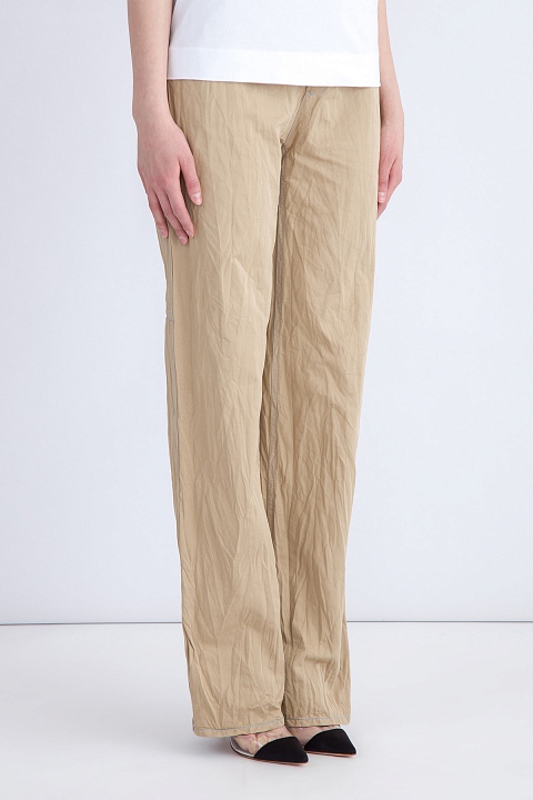Брюки прямого кроя из хлопка и льна с жатым эффектом в песочном цвете
