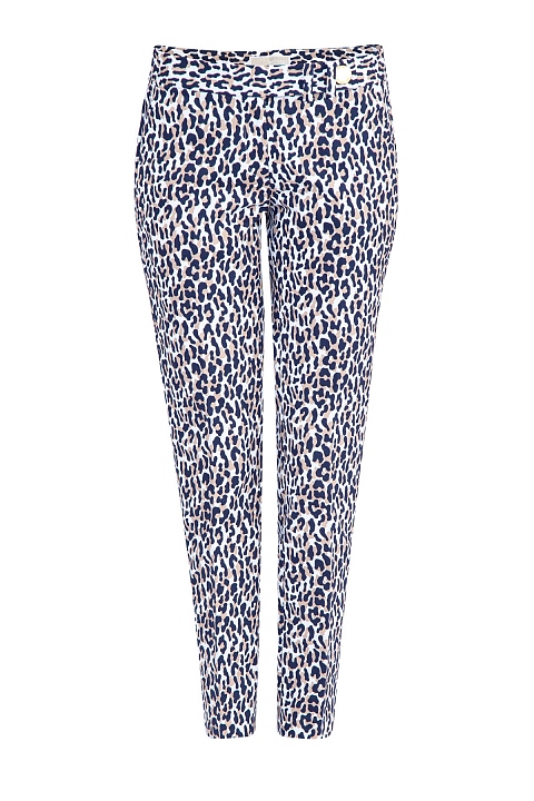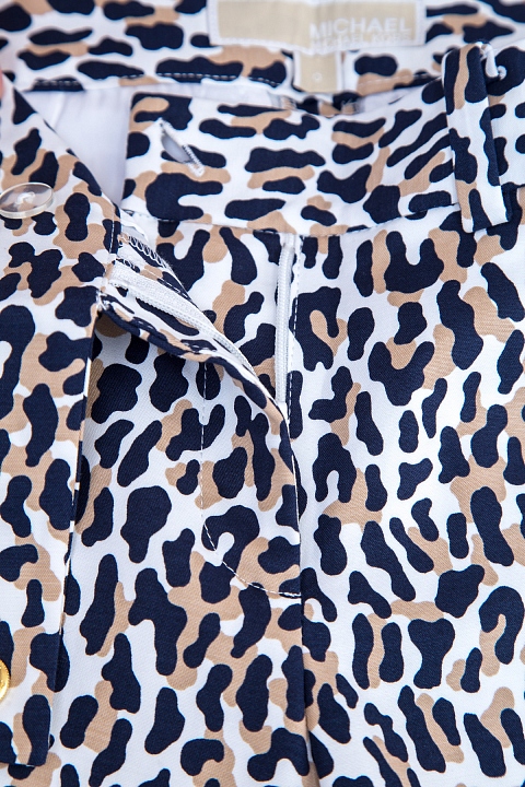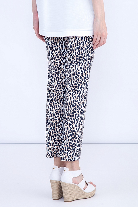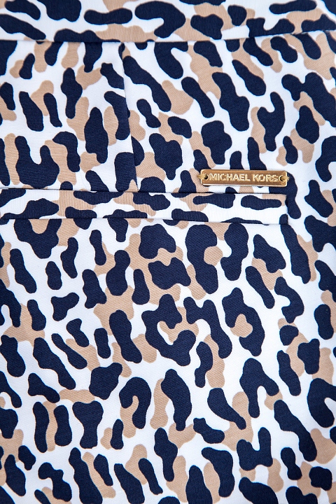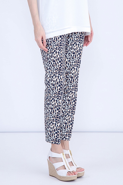 Укороченные брюки-дудочки MICHAEL Michael Kors зауженного кроя. Модель выполнена из легкого хлопка белого цвета с леопардовым принтом и конструктивными стрелками. Изделие с притачным поясом с застежкой на молнию и потайные крючки. Брюки дополнены фронтальными французскими и прорезными задними карманами с металлической эмблемой бренда.