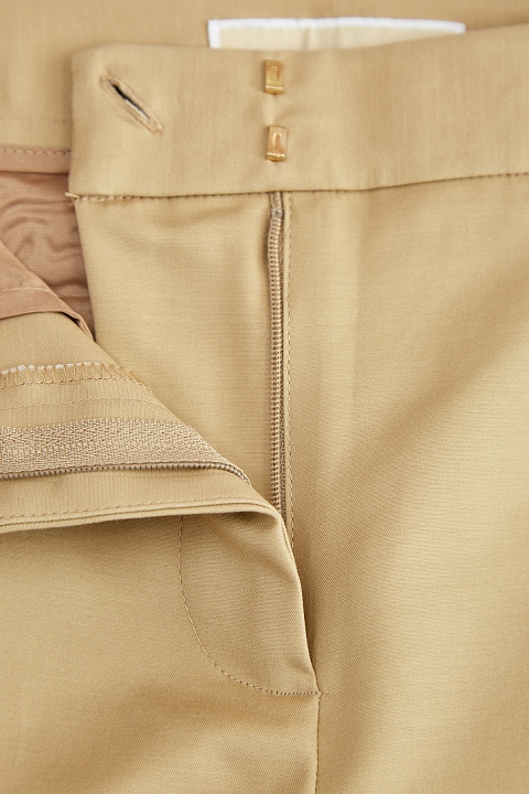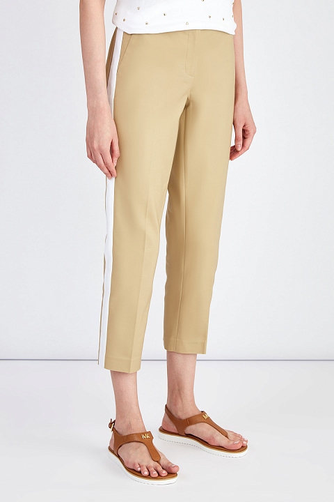 Укороченные женские брюки в стиле спортшик от MICHAEL Michael Kors выполнены из плотного, держащего форму хлопка. Базовый песочный оттенок дополнен лампасами в белом цвете на боковых швах. Детали: классическая средняя посадка, диагональные карманы, прорезные карманы с бортами на спинке, потайная застежка на крючки, пуговицу и молнию.