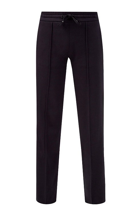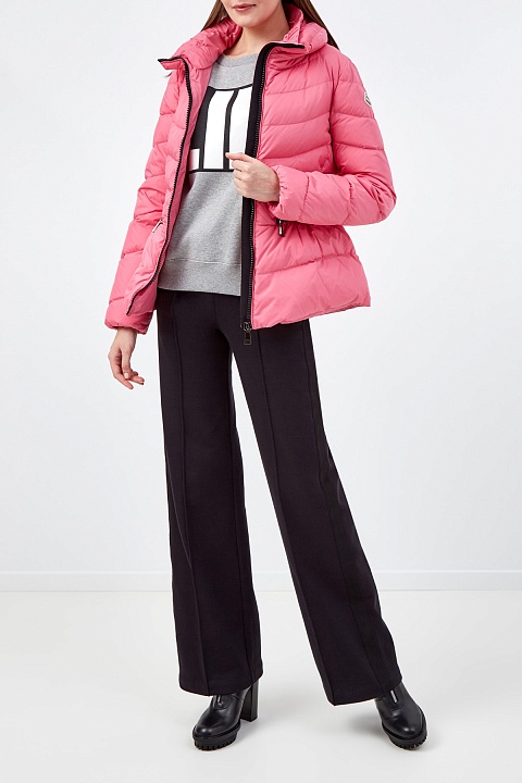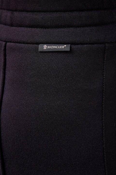 Расклешенные спортивные брюки от Moncler выполнены из плотного хлопкового джерси в черном цвете. Боковые швы с лампасами из ленты грогрен и простроченные стрелки визуально вытягивают силуэт. Эластичный пояс на кулиске обеспечивает максимально комфортную посадку. Детали: прорезные карманы по бокам, один карман на спинке.