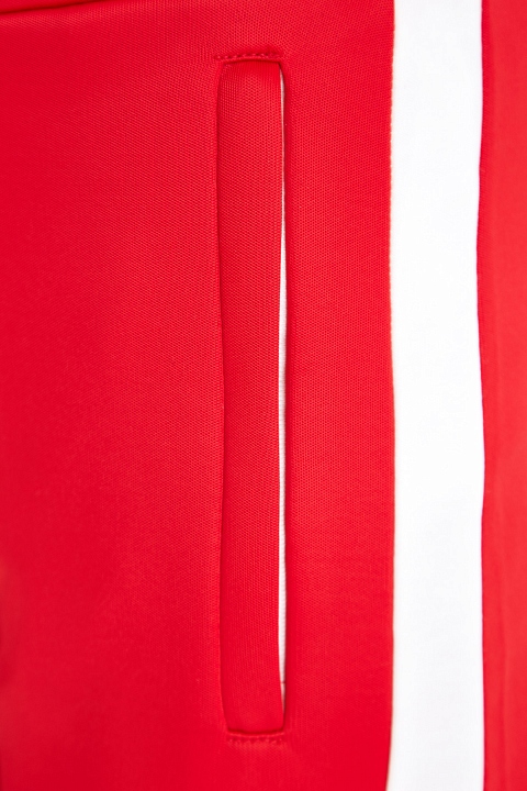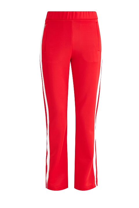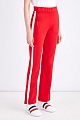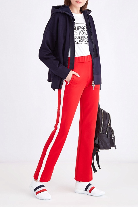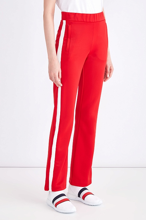 Яркие женские спортивные брюки чуть расклешенного силуэта из весенне-летней коллекции Moncler выполнены из дышащего и эластичного хлопкового пике в насыщенном красном оттенке. Модель дополнена контрастными лампасами белого тона, которые создают образ в спортивном стиле. Два прорезных кармана, а также широкий эластичный пояс-резинка обеспечивают комфортную посадку на талии.