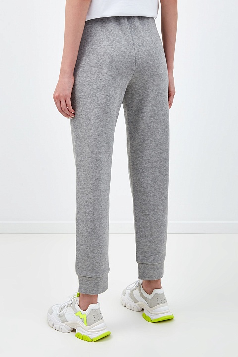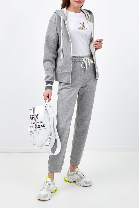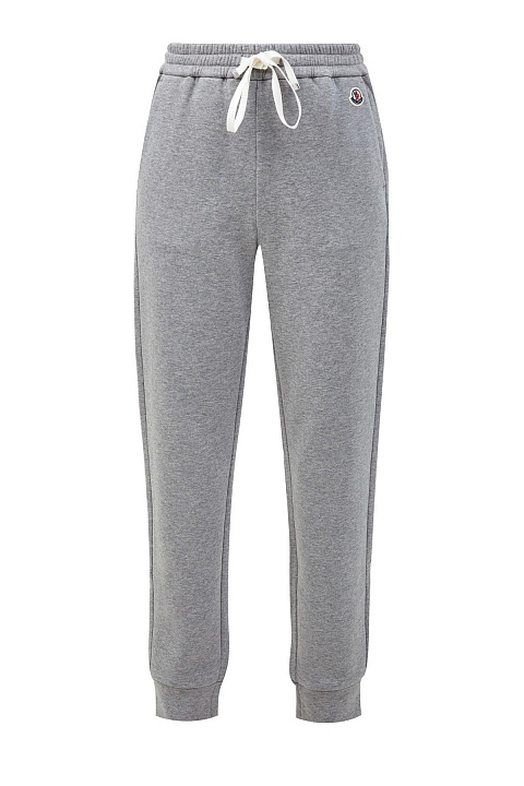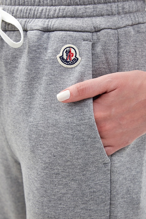 Брюки-джоггеры от Moncler выполнены в меланжево-сером оттенке из плотного хлопкового футера — эластичной и дышащей ткани, которая идеально подходит для активного отдыха и путешествий. Широкий пояс на кулиске обеспечивает максимально комфортную посадку. Детали: два прорезных кармана, логотип из фетра, фактурная внутренняя поверхность.