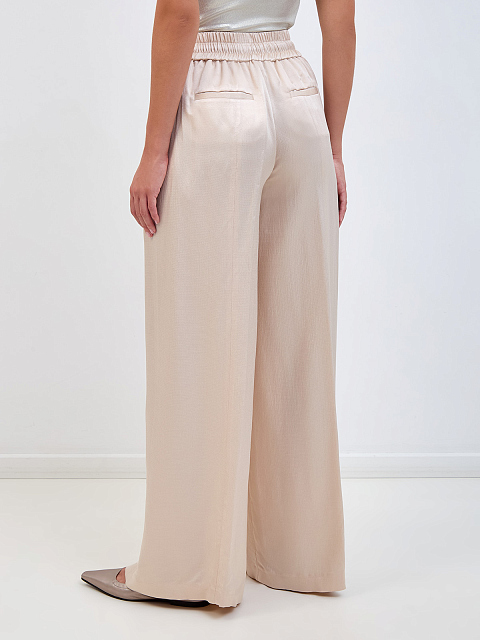 Элегантные брюки-палаццо в жемчужно-бежевом оттенке от Peserico. Модель создана из металлизированной ткани на основе вискозы и шерсти с сатиновым блеском, струящийся материал идеально подходит для создания повседневных и вечерних образов. Высокий эластичный пояс с регулируемой кулиской визуально моделирует силуэт. Детали: прорезные карманы, заложенные складки. Сделано в Италии.