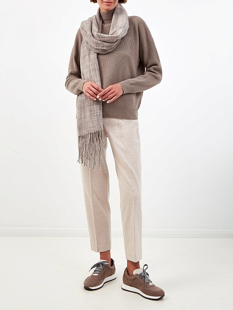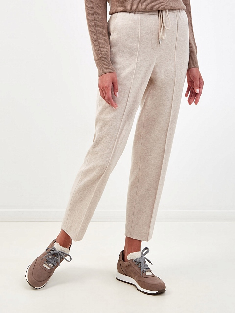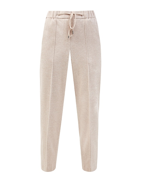 Женские брюки в меланжево-бежевом оттенке от Peserico. Модель выполнена из мягкого хлопка и шерсти, благодаря полностью натуральному составу ткань не стесняет движений. Эластичный пояс на кулиске и заложенные складки обеспечивают комфортную посадку по фигуре. Детали: декоративная вертикальная стежка, прорезные карманы.
