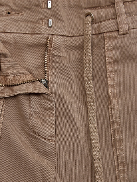 Элегантные брюки от Peserico выполнены в песочном оттенке, плотная текстура хлопкового габардина идеально сочетается со слегка зауженным силуэтом и свободными линиями бедер. Накладные макро-карманы и отвороты по нижнему краю подчеркивают неформальный фасон изделия. Детали: пояс на кулиске, застежка на молнию и крючки, фирменный патч из кожи. Сделано в Италии.
