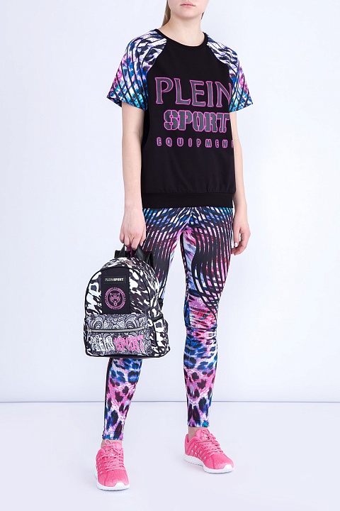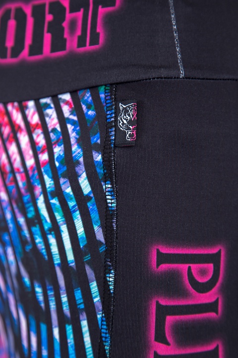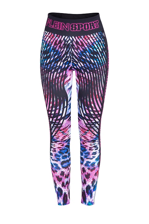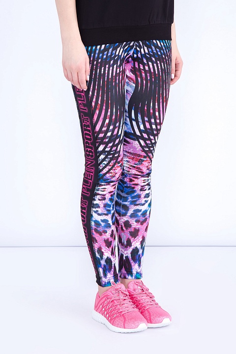 Спортивные леггинсы из линии «Plein Sport» бренда Philipp Plein. Модель выполнена из тончайшей лайкры с пестрым принтом «Athlete Vivienne» и характеризуется эластичным широким поясом на линии талии, украшенным символикой Модного дома. По бокам имеются стилизованные лампасы, завершающие изделие.