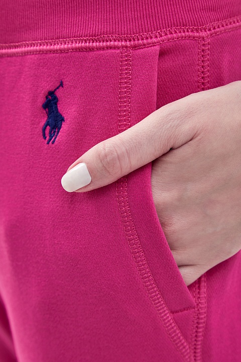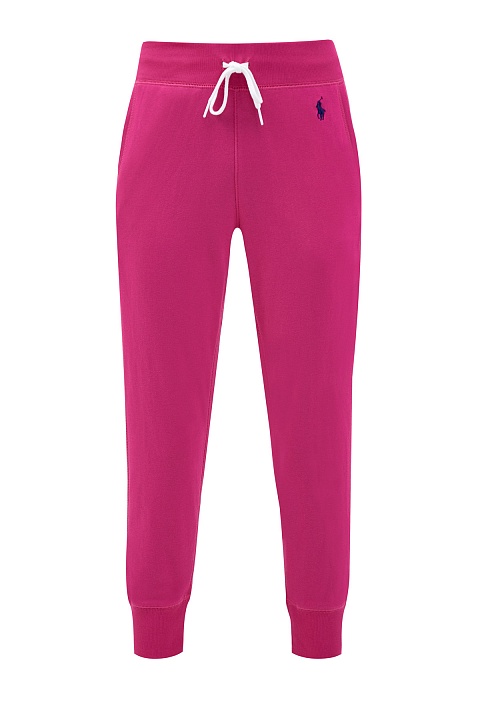 Брюки-джоггеры от Polo Ralph Lauren выполнены в насыщенном оттенке фуксии из плотного хлопкового футера — эластичной и дышащей ткани, которая идеально подходит для активного отдыха и путешествий. Широкий пояс на кулиске обеспечивает максимально комфортную посадку. Детали: два прорезных кармана, вышитый логотип, фактурная внутренняя поверхность.