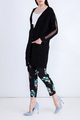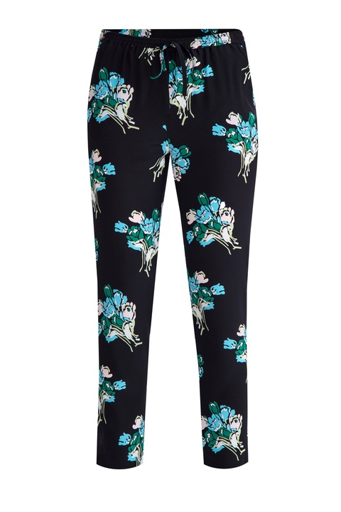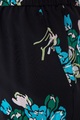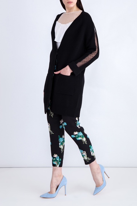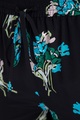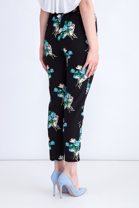 Укороченные женские брюки REDValentino свободного спортивного кроя. Модель создана из креп-шелка черного цвета с принтом «Букет тюльпанов» в голубой гамме. Модель с посадкой на талии, оформленной эластичным поясом со шнурками и множеством мягких складок.