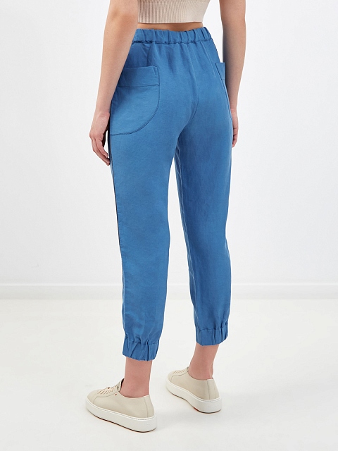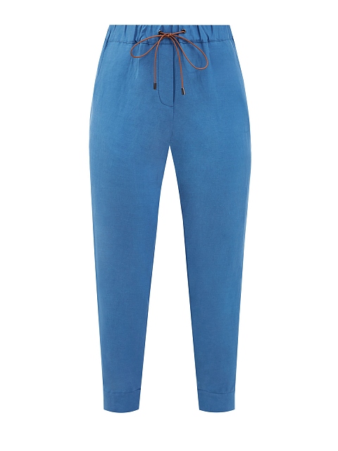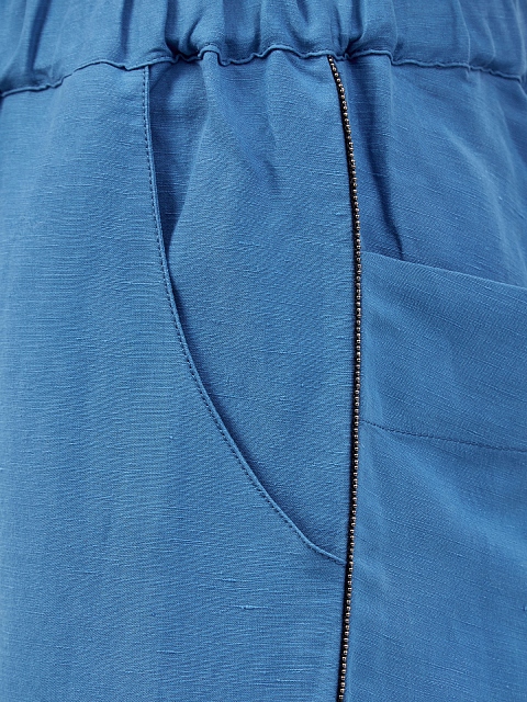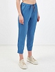 Женские брюки в расслабленном стиле от Re Vera. Укороченная модель в небесном оттенке выполнена из мягкой ткани на основе волокон шелка и дышащего льна. Пояс на кулиске и эластичные манжеты обеспечивают комфортную посадку по фигуре, отделка ювелирными цепочками придает изделию мерцающий акцент.