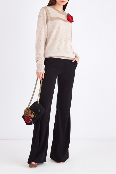Минималистичные женские расклешенные от колен брюки из весенне-летней коллекции Sonia Rykiel выполнены из струящейся ткани в лаконичном черном оттенке. Высокая посадка и сложный крой с прошитыми швом внутрь стрелками зрительно вытягивает силуэт. Модель с двумя прорезными карманами на передних планках и притачным поясом с петлями для ремня, а также застежкой на молнию и крючок.