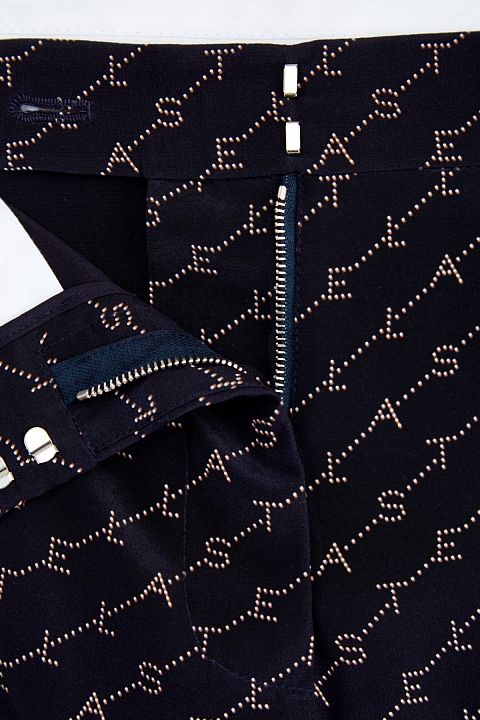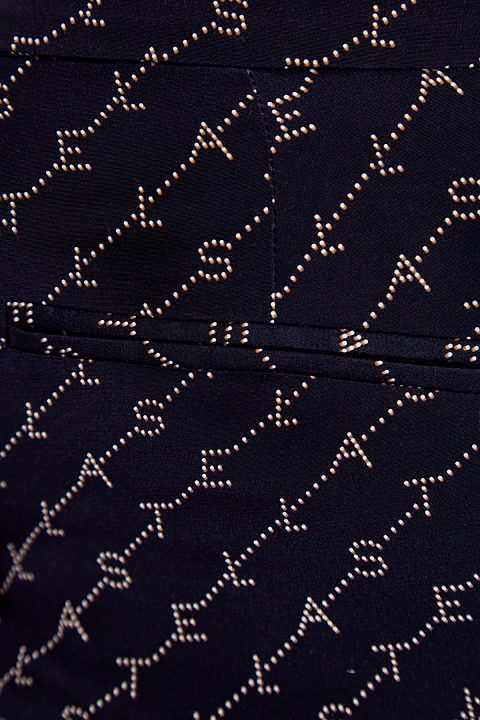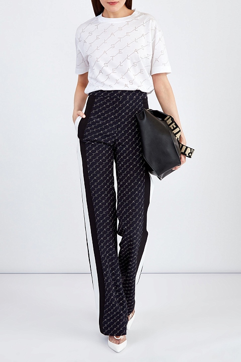 Эффектные брюки широкого кроя Dana от Stella McCartney выполнены из чистого шелка в чернильно-синем оттенке. Модель декорирована принтом с эффектом перфорации, широкие черно-белые лампасы из тканых лент придают образу нотку спортивного стиля. Детали: высокая посадка, прорезные карманы, потайная застежка на крючок и молнию.