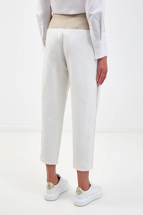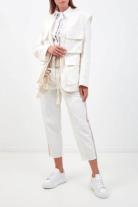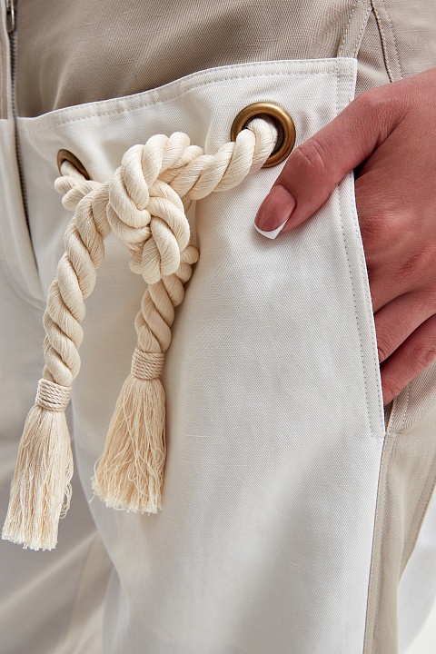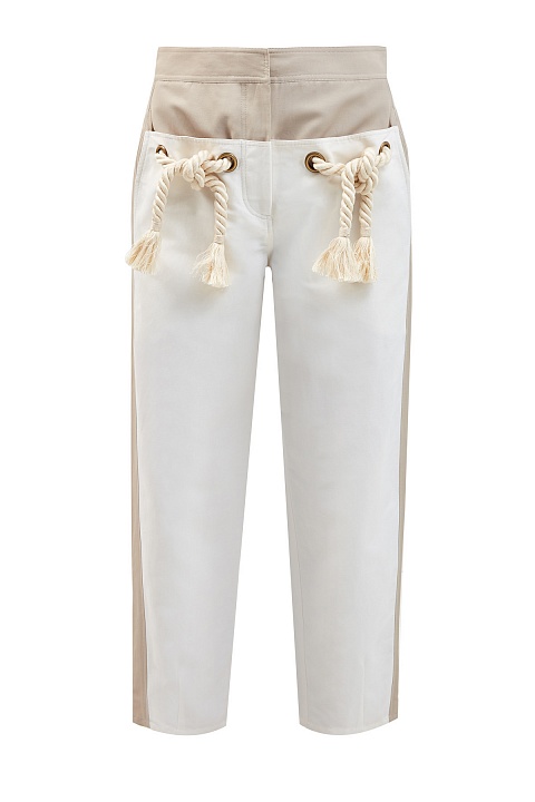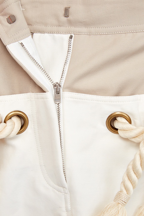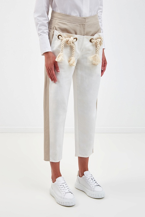 Укороченные брюки от Stella McCartney выполнены из прочного материала на основе волокон хлопка и льна. Сочетание бежевых и белых поверхностей в технике пэчворк делает модель идеальной для расслабленных летних образов. Элемент декора в виде плетеных шнуров, завязанных в крупные узлы, придает аутфиту акцент в морском стиле. Детали: прорезные карманы по бокам, люверсы с металлизированной отделкой, потайная застежка на крючок и молнию.