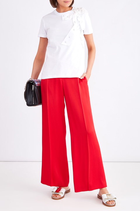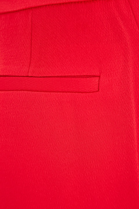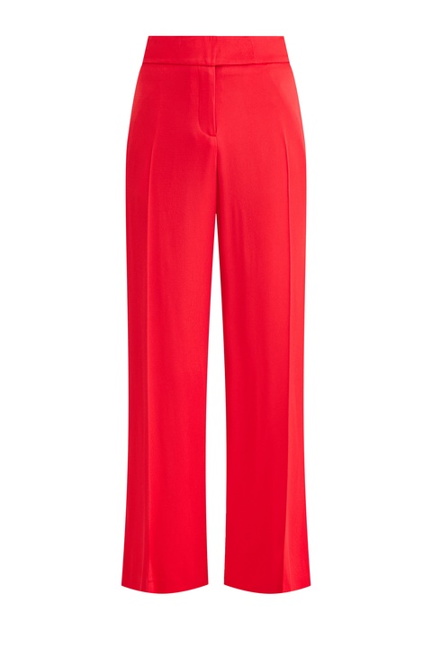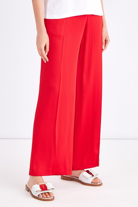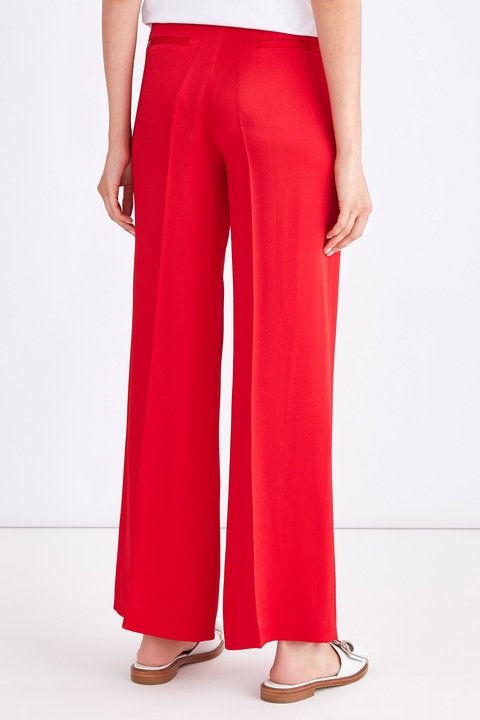 Яркие женские брюки из коллекции Tara Jarmon, характеризующиеся широкими брючинами, расклешенными от бедра. Модель создана из мягкой ткани в составе ацетатного шелка и вискозы с матовой фактурной поверхностью алого цвета. Изделие завершает широкий притачной пояс с потайными крючками и застежкой-молнией, а также прорезные брючные карманы по бокам и сзади.
