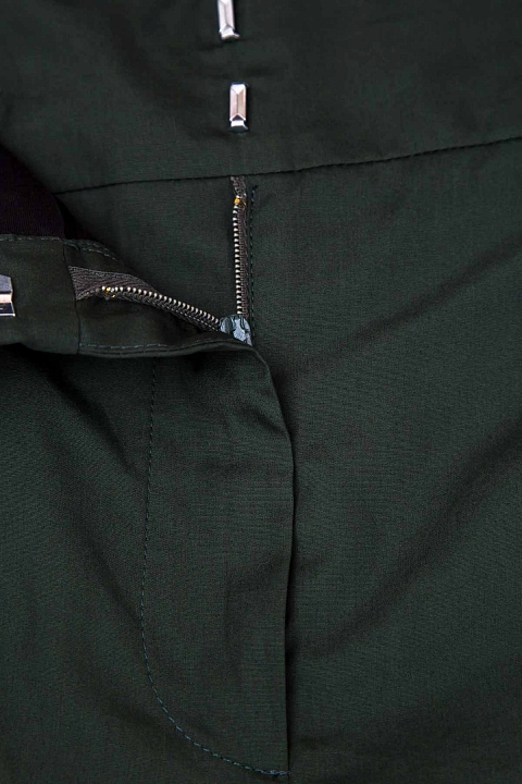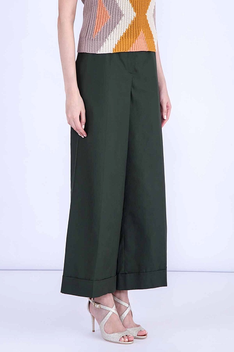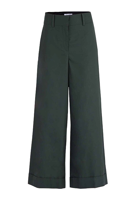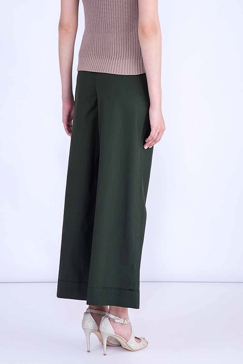 Стильные женские брюки-кюлоты Valentino свободного кроя выполнены из плотного хлопка изумрудно-зеленого цвета. Модель с завешенной посадкой на талии, осуществляющейся при помощи широкого притачного пояса со шлевка-петлями для ремня и застежкой на молнию и потайной крючок. По бокам и сзади имеются прорезные карманы. Кромки брючин дополнены отворотами. Сделано в Италии.