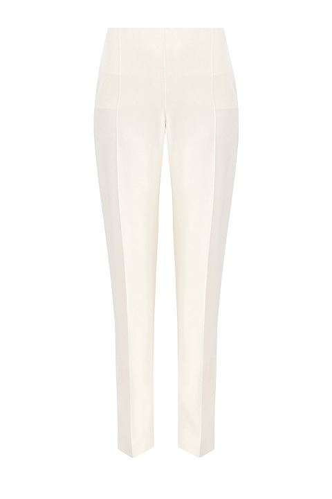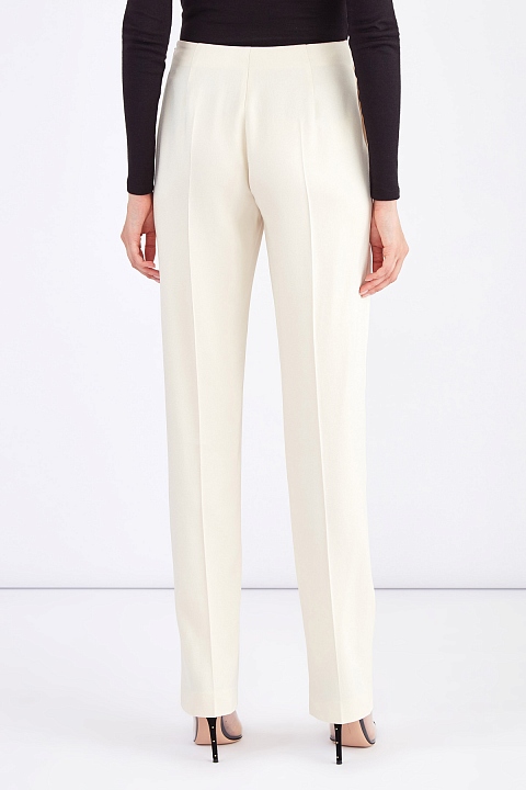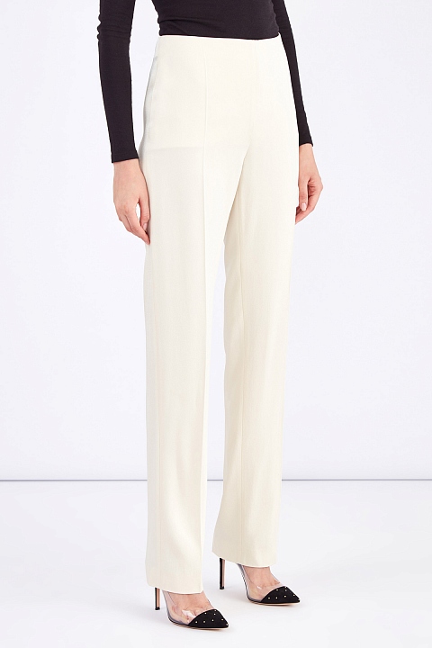 Минималистичные брюки прямого кроя из коллекции осень-зима от Valentino выполнены из струящейся вискозной ткани кремового цвета с мягким сатиновым блеском. Модель классического прямого кроя дополнена внутренней частичной подкладкой на передней планке для лучшей посадки и предотвращения образования складок. Крой предусматривает вытачки, подчеркивающие силуэт. Потайная застежка в боковом шве подчеркивает лаконичный дизайн изделия. Сделано в Италии.