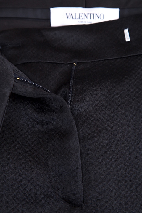 Легкие женские брюки Valentino свободного кроя, расклешенного от бедра. Модель выполнена из смесового шелка черного цвета, характеризующегося полупрозрачной гладкой текстурой с фактурным узором на поверхности. Изделие с посадкой на талии на широком притачном поясе дополнено французскими фронтальными и прорезными задними карманами. Сделано в Италии.