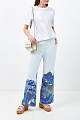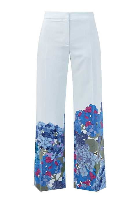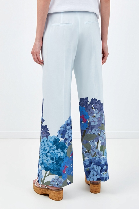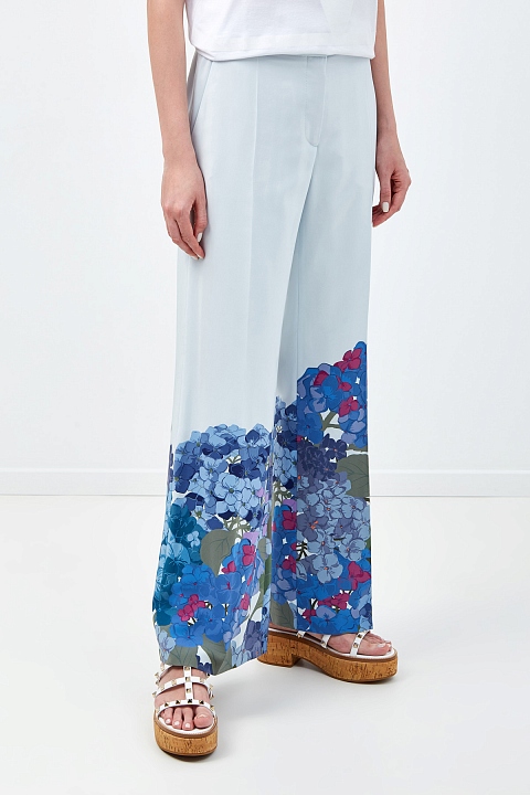 Расклешенные от бедра брюки от Valentino. Модель в оттенке «голубая пастель» выполнена из струящегося шелкового крепа, легкий и воздушный образ подчеркивает асимметричный цветочный принт Macro Ortensia. Свободный крой и классическая средняя посадка обеспечивают максимальный комфорт. Детали: прорезные карманы, застежка на крючок, пуговицу и молнию. Сделано в Италии.