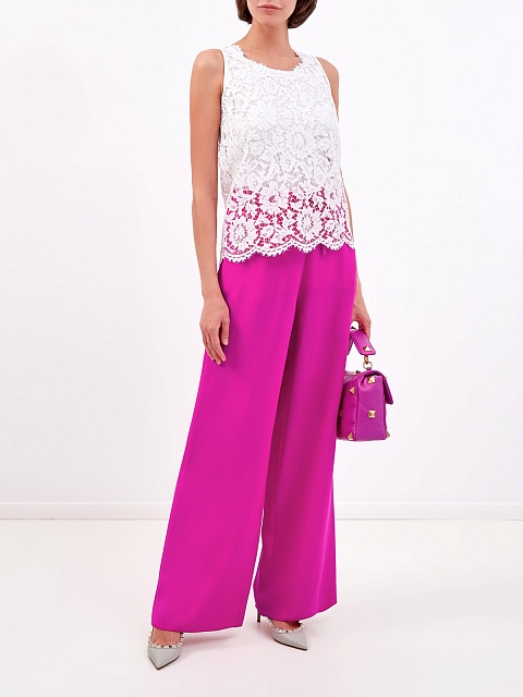 Эффектные брюки-палаццо от Valentino выполнены из шелковой ткани Cady Couture в оттенке фуксии. Струящийся материал подчеркивает расслабленные линии кроя и придает дизайну фирменный итальянский шик. Эластичный пояс на кулиске и два прорезных кармана делают модель функциональной и комфортной. Детали: высокая посадка, простроченные швы. Сделано в Италии.