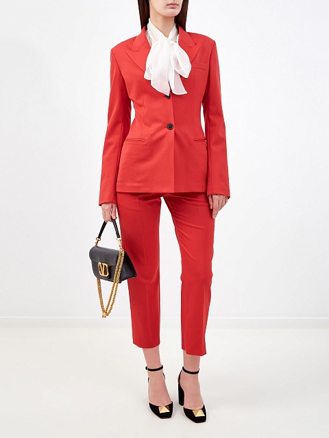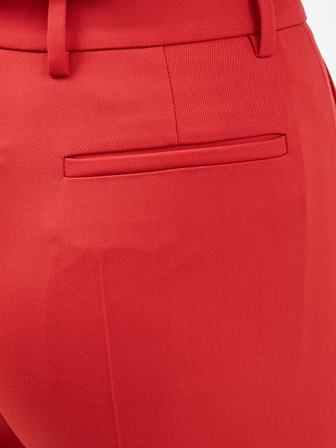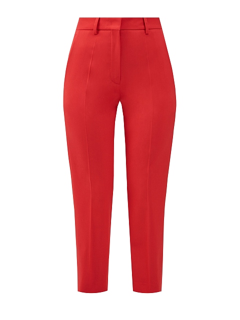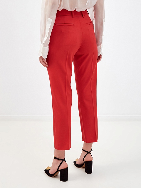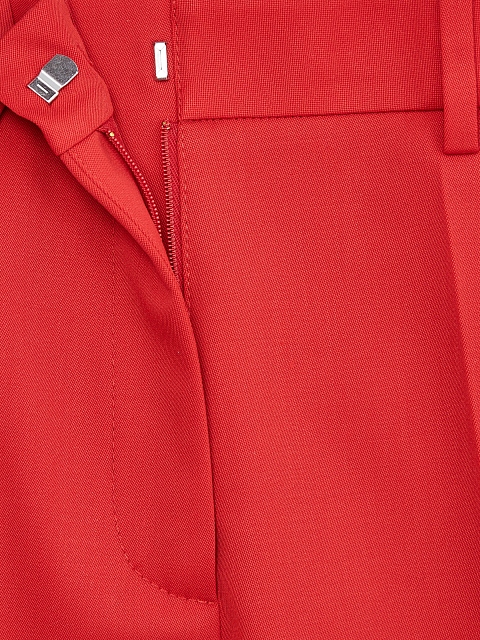 Элегантные брюки укороченного кроя от Valentino созданы из тонкой ткани Stretch на основе шерсти и волокон эластана. Модель представлена в ярком алом оттенке с матовым блеском. Завышенная посадка делает повседневные образы максимально комфортными, а заложенные стрелки визуально вытягивают силуэт. Детали: застежка на молнию, четыре кармана. Сделано в Италии.